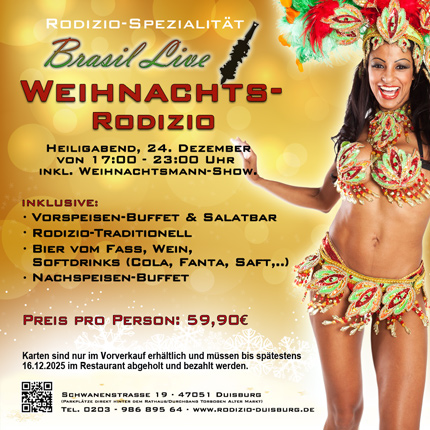 Am 25. & 26. Dezember genießen Sie unser Rodizio Traditionell inkl. Getränke (Bier & Softdrinks) zum Pauschalpreis von 49,90€ pro Person.