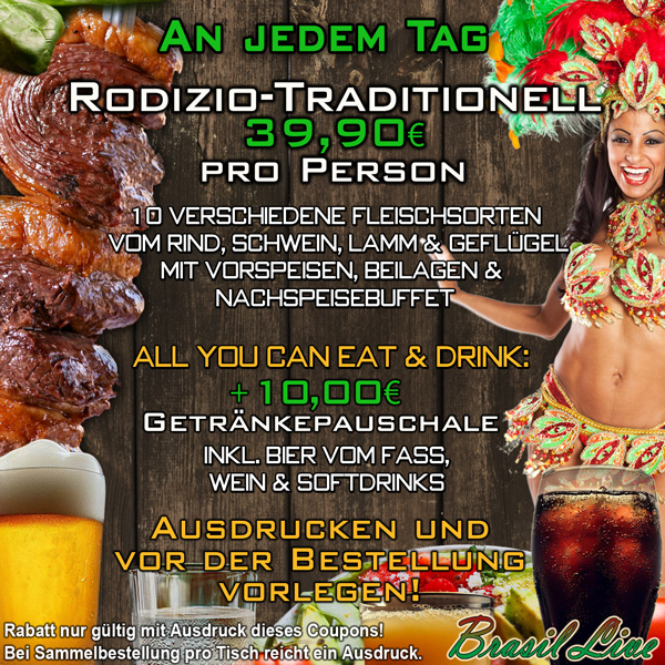 Genießen Sie unser “Rodizio Traditionell” für 39,90€ + 10,00€ als “ALL-YOU-CAN-EAT & DRINK”, d.h. inklusive Getränkepauschale für Bier vom Fass, Wein und Softdrinks!