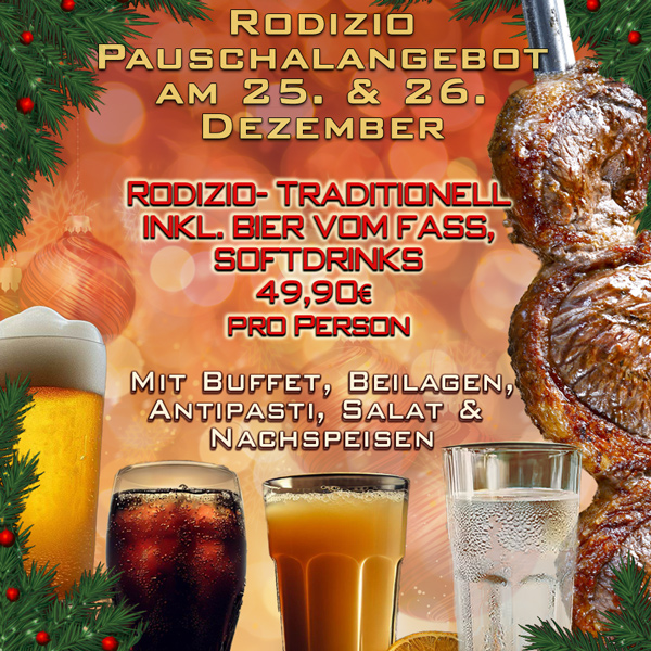 An den Weihnachtsfeiertagen, am 25. & 26. Dezember 2025, genießen Sie unser “Rodizio Traditionell” inklusive Getränke (Bier vom Fass und Softdrinks wie Cola, Fanta, Saft) zum Pauschalpreis!